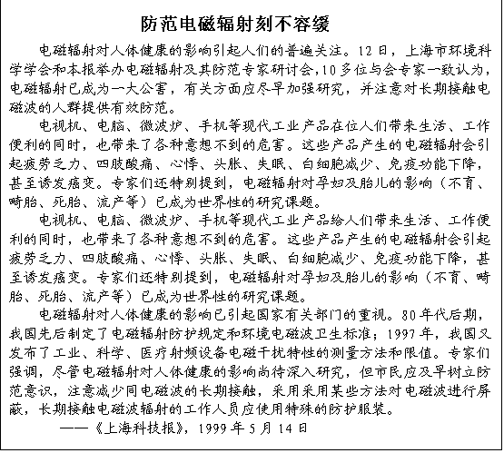 4 、對于電磁輻射的重點單位要嚴格監控其電磁輻射量,在其周圍種植綠化帶、防護林,對輻射超標這給予重罰,并勒令其限期整改。在這些單位的員工中大力開展對電磁輻射的學習活動,定期對員工進行體檢。輻射強的單位應給職工發放防護服。